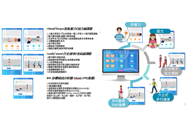 智能肌力檢測模組 Intelligent long-term care detection module:全台唯一互動情境指引,依據使用環境,選購肌力檢測模組,使用語音導引判斷反應時間,與全模組介接平台,自動收集數據,產出各項指標曲線圖表與整合報表。